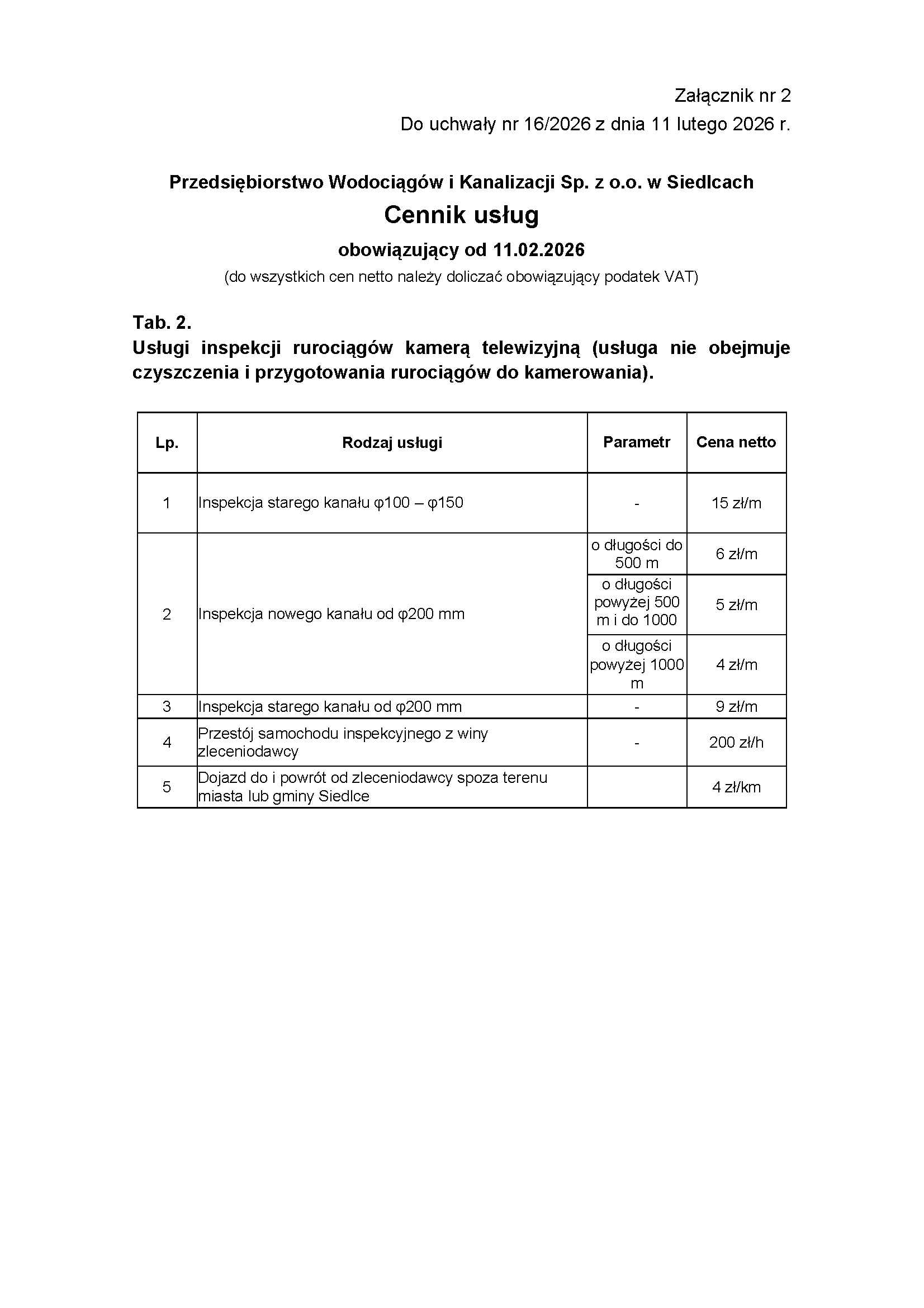 A pomniejsz czcionkę A standardowy rozmiar A powiększ czcionkęZałącznik Nr 2 i nr 3 do Uchwały Zarządu Przedsiębiorstwa Wodociągów i Kanalizacji Spółka z ograniczoną odpowiedzialnością w Siedlcach Nr 16/2026 z dnia 11 lutego 2026 roku